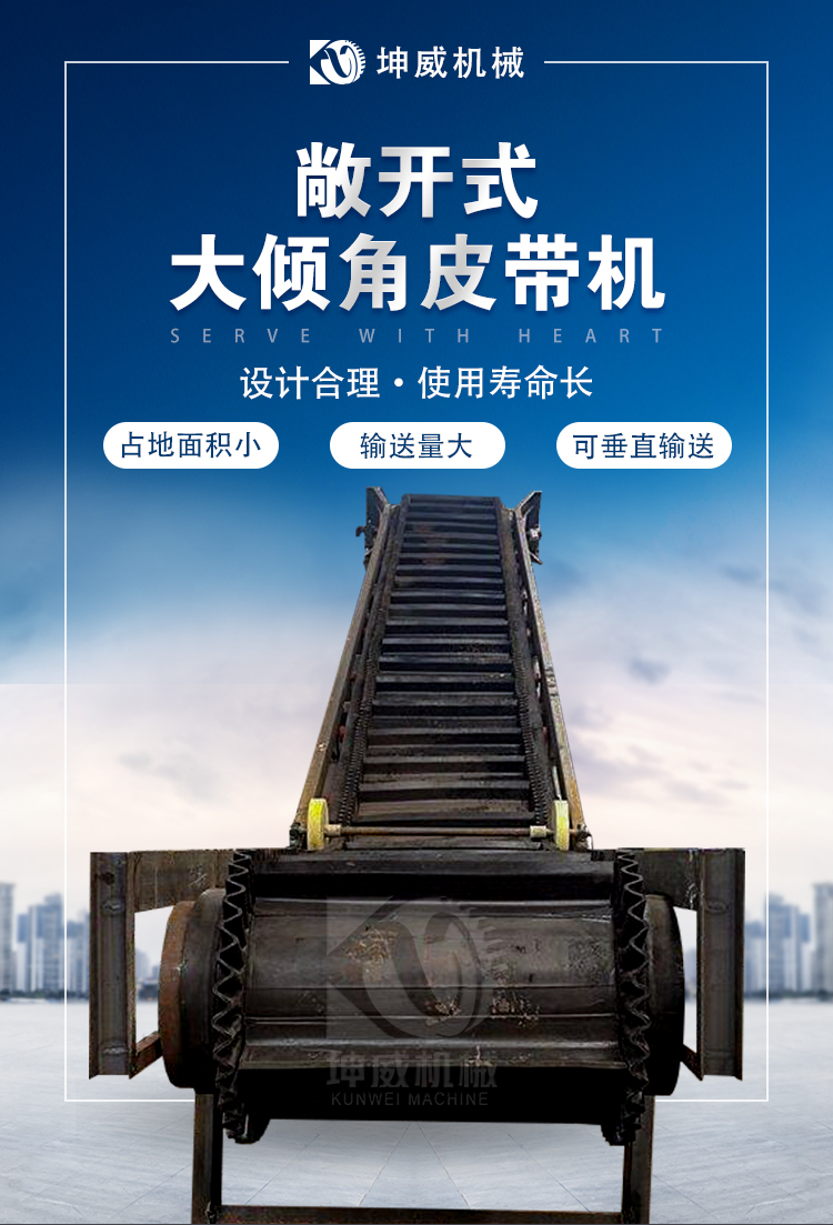 先說一下大 傾角帶式輸送機(jī) 的優(yōu)勢 (1)大傾角帶式輸送機(jī)的輸送傾角大,可達(dá)90,是大傾角輸送和垂直提升的理想設(shè)備。因此可以節(jié)約占地面積,節(jié)省設(shè)備投資和土建費(fèi)用,取得良好